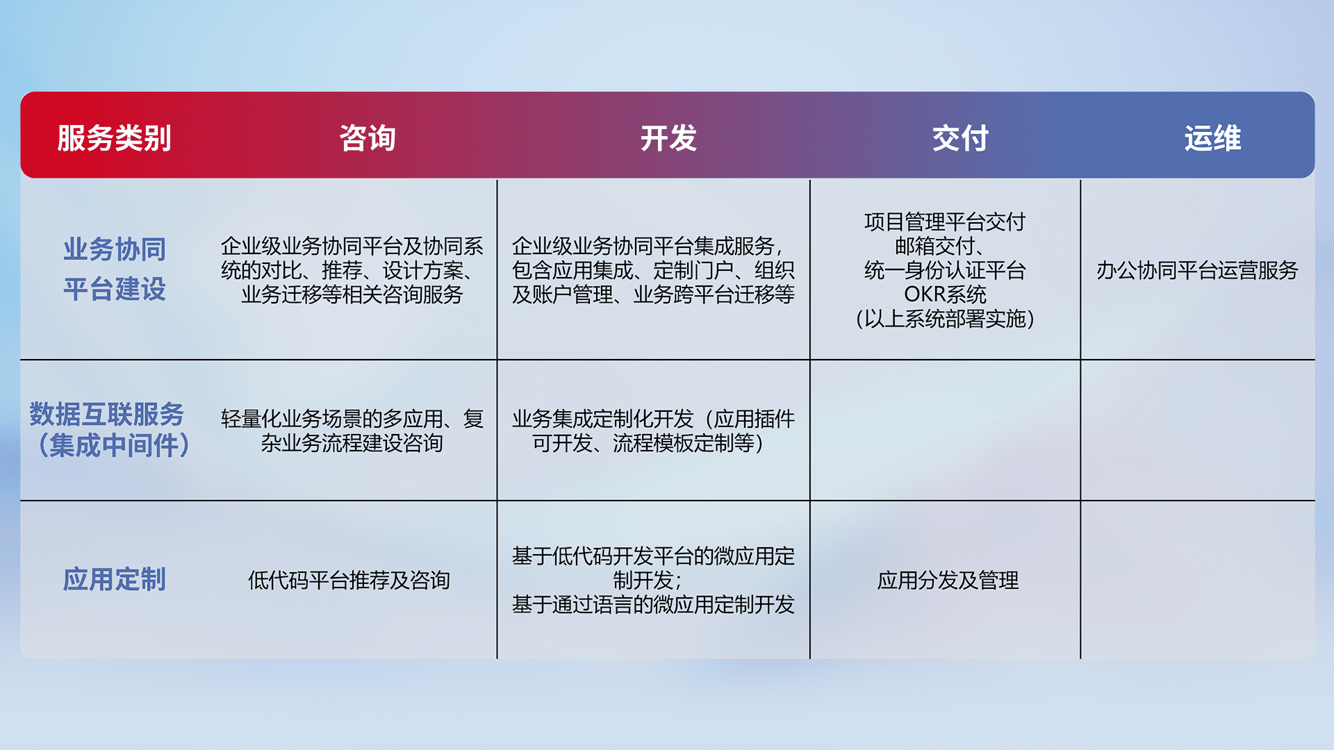 针对钉钉、、、、企微、、、IDaas等平台级产品提供产品的规划、、方案、、交付、、、、定制化开发等服务,,,,实现如统一协同办公、、智能客户服务、、、混合会议管理、、、、智能数据查询、、、等业务场景,,,,实现数字化转型。。。。